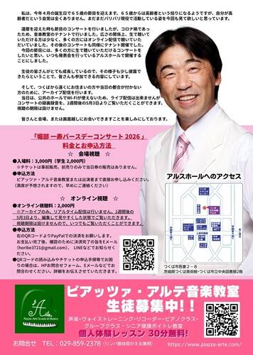 当日は、公共のホールでWi-Fiが使えないため、ライブ配信は出来ませんがコンサートの録画録音を、2週間後の5月3日よりご覧いただくことができます。視聴の期限は設けません。